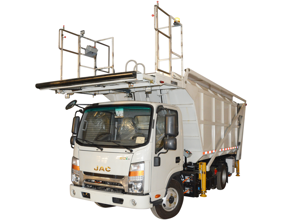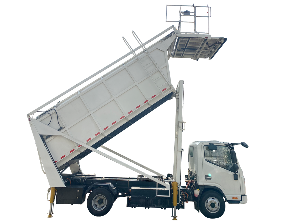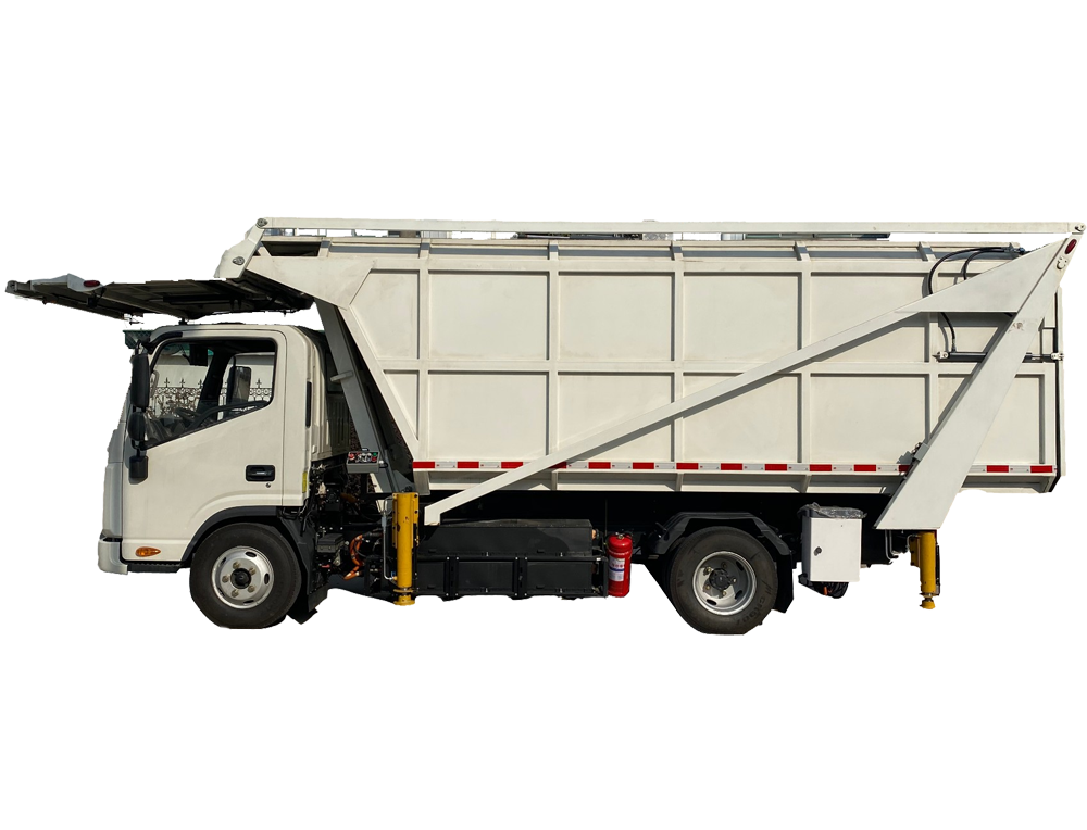 DGR10e型電動飛機垃圾接收車,主要由新能源汽車二類底盤、副車架、垃圾箱體總成、舉升門架、液壓傳動系統(tǒng)、電氣系統(tǒng)組成。